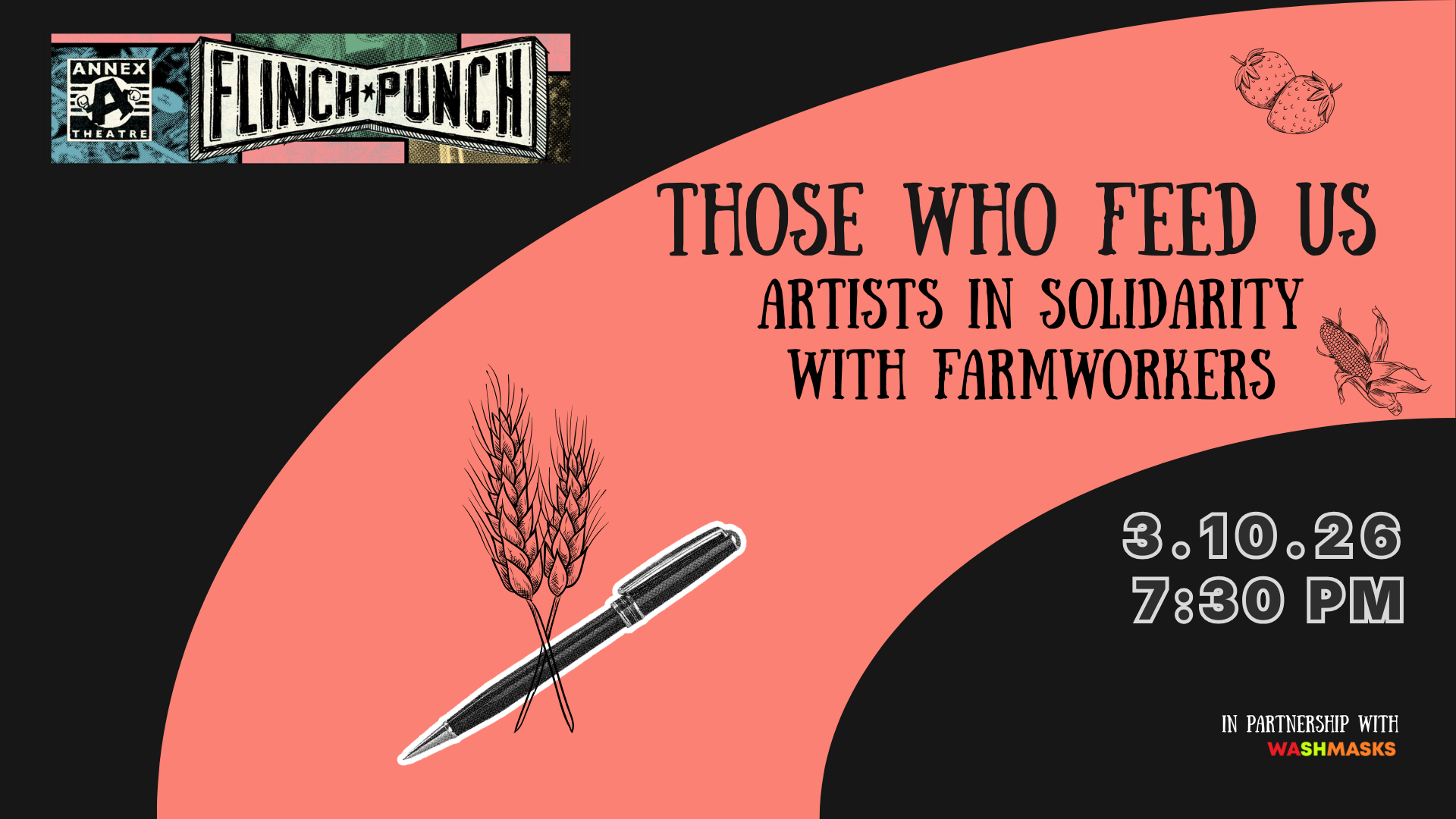Join Annex Theatre and WashMasks Mutual Aid in an evening of performance and direct action in solidarity with Washington farmworkers. Learn about the deep connections between artists and farmworkers and the importance of of artist participation in farmworker justice. Farmworker justice is the intersection of many social justice movements— immigrant justice, labor justice, climate justice, housing justice, and food justice. When we fight for the safety, equity, and dignity of the communities who feed us, we fight for us all. All funds raised from this event shall go towards Nuestra Casa and their grassroots efforts in addressing food access for farmworkers and migrant families in the Lower Yakima Valley.
